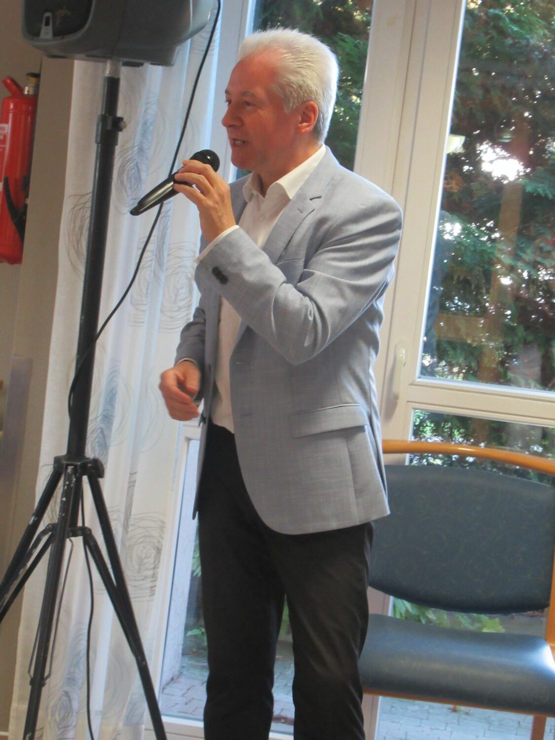 Auf dem Vorhof empfing uns der Alleinunterhalter mit flotter Musik. Unter den geschmückten Pavillons, standen geschmückte Tische und Stühle. Leckere Getränke und Knabbergebäck standen auch bereit. Die größte Überraschung war der Besuch von unserem Bürgermeister Herrn Brückmann. mit seinem Grußwort und Neuigkeiten.