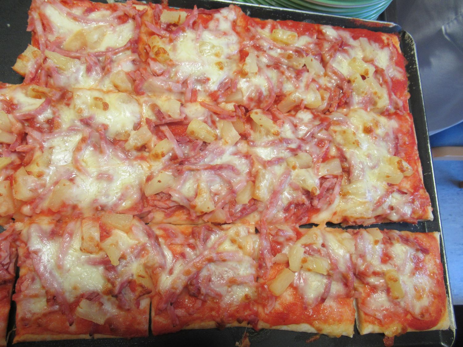Zum Abendessen sorgte das Küchenteam für die größte Überraschung. Es wurden vier verschiedene Pizzen angeboten und alles reichlich, es schmeckte uns sehr gut, denn auch ein Gläschen alkoholfreies Bier rundete das Abendessen ab.